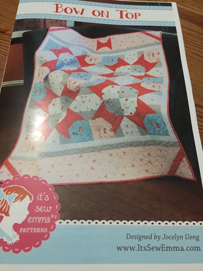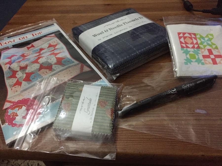 Un patrón de quilt, un boli frixion, lanas franelas, squares y el regalito