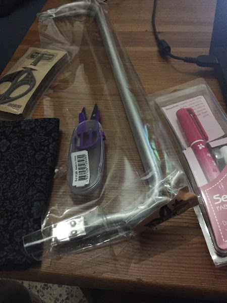 Una boquilla tubular para el próximo tutorial de Xisca, pegamento para aplicaciones, un cortahilos, unas tijeritas de bordado y un fat quarter de una tela muy bonita... aischhh qué contenta estoy!!!