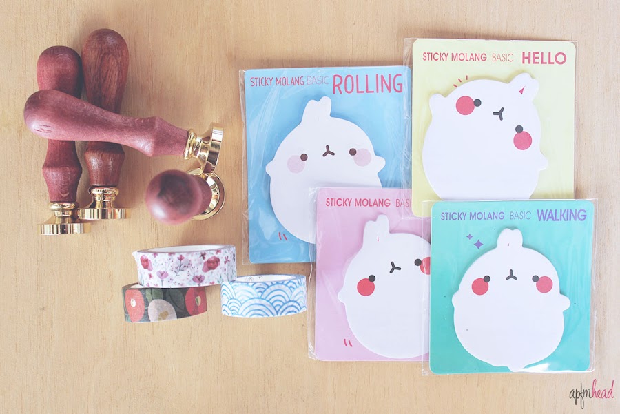 - Sellos lacre - Post-its Molang - Washi flores fondo negro - Washi Flores fondo blanco - Washi azul -