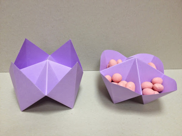 Un recipiente también casero, que no es más que con una cartulina formando un comecocos!!! y en cada hueco un puñadito de peladillas.