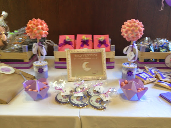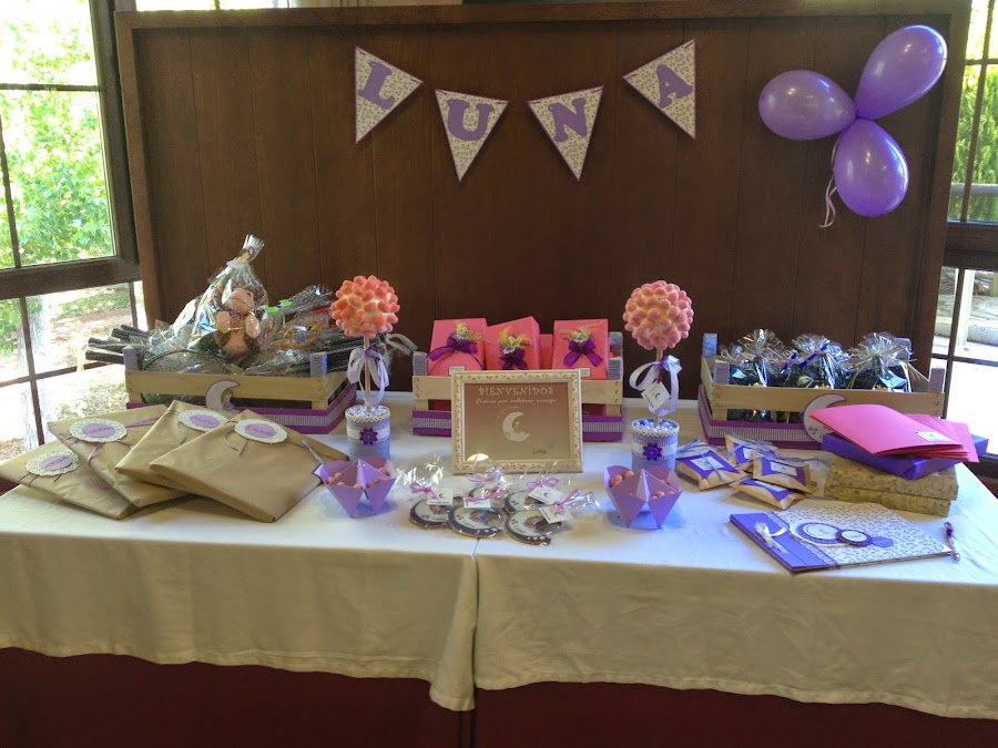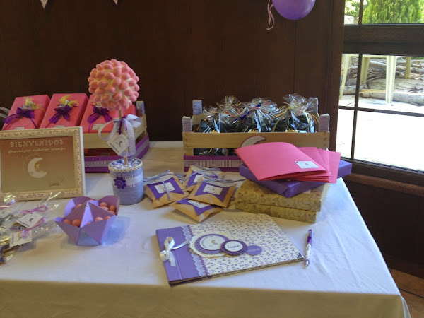 En la zona posterior veis las cajas para los detalles de los invitados, mujeres, hombres y como no niños. En unos días os muestro como preparé las cajas y que son en realidad!!! Y en la parte de arriba una guirnalda con el nombre de Luna, con goma eva, papel decorado y cartulina, para rematar tres globos de color.... morado!!! jajaj.