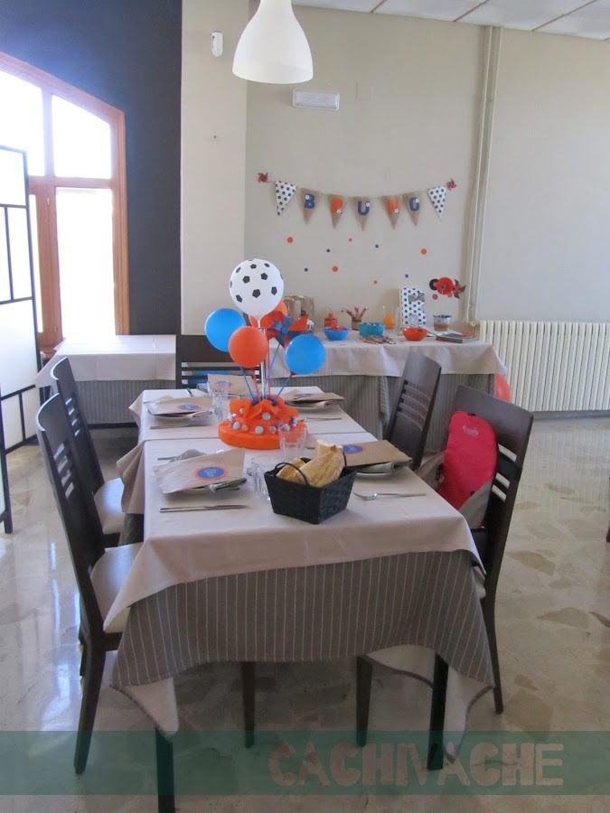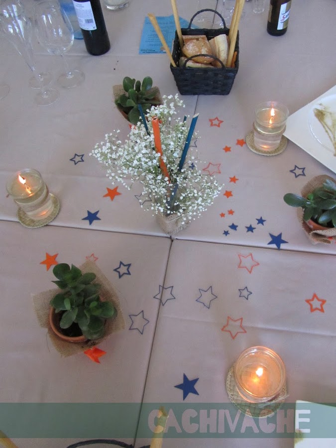 Juntamos cuatro mesas para la de los mayores. En el centro, como había espacio coloqué tres velas y tres macetas, con la manía mía de poner impares, además de un jarrón con paniculata y dos ramas en azul y naranja. Y para unificar el conjunto unas estrellas en los mismos colores.