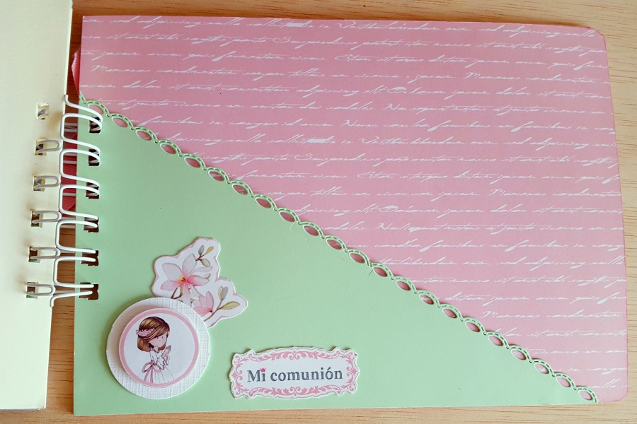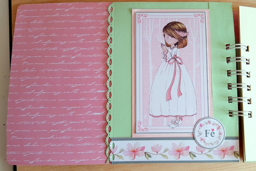 Las tapas por dentro tienen bolsillos en cada cara, para que pueda guardar alguna foto o tarjetas que le hallan regalado. Confieso que al comienzo tenía mis dudas con esta cartulina verde clara. El color no terminaba de convencerme, pero en cuanto comencé a troquelarla y combinarla con los rosas de los papeles, quedé completamente enamorada de ella.