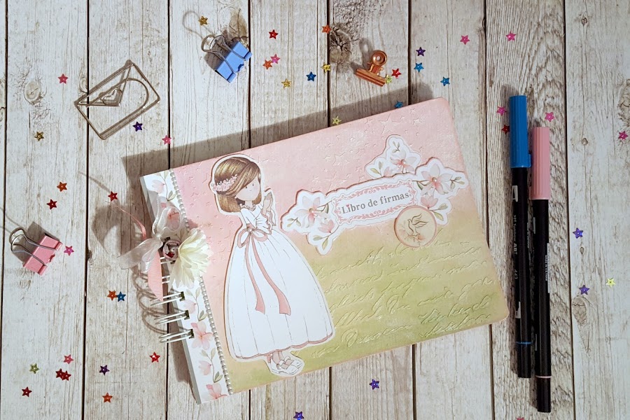 Este primero es el libro de firmas que hice con las tapas de cartón y las hojas que vienen en el kit. Para las texturas utilicé modeling paste con mis plantillas de estrellas y texto. Los colores los dí con una esponja, mezclando las pinturas acrílicas de Carrotcake (Organic Pink y Spicy Violet) con el basic Perl Gel (Carrotcake) para la zona rosa. Y para la zona verde utilicé el color Frontón de Artis, mezclado también con Perl Gel. En los bordes apliqué Distress Oxide en color Worn Lipstick.