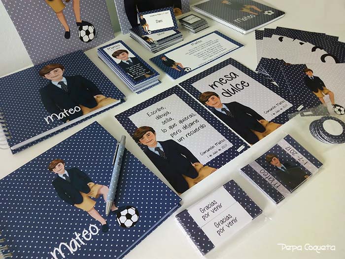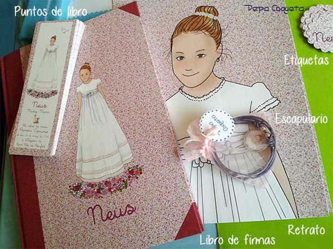 Si vas algo perdida de qué puedes encargar para que la Comunión sea completa, aquí te dejo algunos ejemplos de conjuntos, como verás, siempre va todo a juego y a la medida que necesites, detalles para tus invitados, etiquetas para los regalos, adhesivos para botellas, pomperos, frasquitos..., banderín para la mesa dulce, imanes, espejos, recortables, bolígrafos, pulseritas... todo lo que se te ocurra, y si no lo ves, pídelo!!
