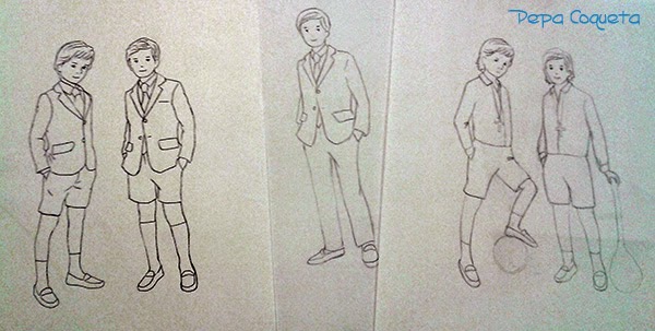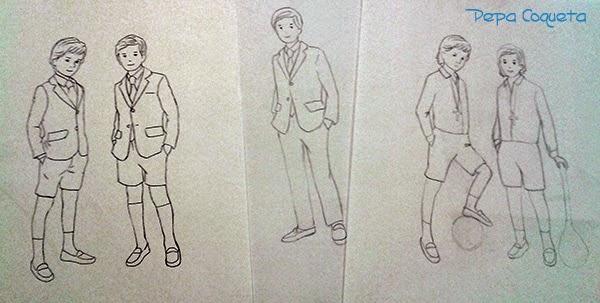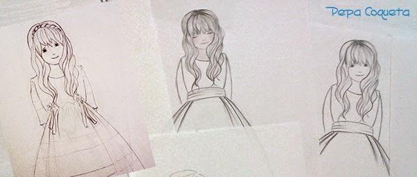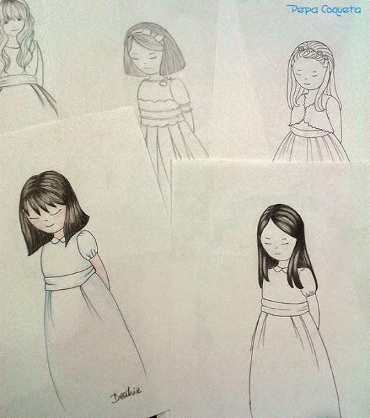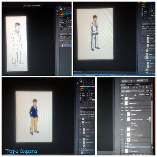 Me he dado cuenta, que al hablar con las mamás, algunas piensan que los modelos que tengo son una especie de plantillas hechas a trozos, como el juego de moda, por un lado las cabezas con diferentes cortes de pelo, por otro los cuerpos, después las faldas y pantalones y finalmente los pies. Y que todo eso se mezcla o combina a gusto del personal y se pinta. Otras incluso me han llegado a decir, "le retiras un poquito el pelo de la cara y que caiga más por los hombros..." A ver... que eso es hacer el dibujo de nuevo, que no es cuestión de tocar con el ratón y mover la mecha... Vamos,... nada más lejos de la realidad. Cada dibujo, como modelo inicial está hecho a mano, es una silueta a tinta o lápiz. Cuando me piden un modelo con una ropa diferente, se dibuja de nuevo, entero, una nueva silueta que será el contorno del nuevo dibujo. Este nuevo dibujo o silueta es la que paso a Photoshop, a través del escáner o por una foto, según me venga mejor en el momento (luz, tiempo...) Ya en la pantalla, a través de capas, voy dando tono, empiezo por la piel, luego la ropa y después el pelo. Todas estas partes, llevan a su vez un montón de capas, de sombras, brillos, detalles,... Una vez está hecho el dibujo del niño o niña, se guarda como otro modelo junto con el original.