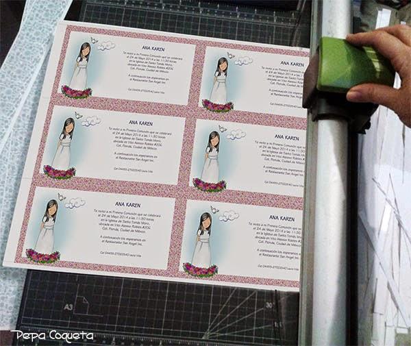 Una vez se tiene el modelo definitivo, se crea un nuevo archivo, esta vez para la imprenta. En función del producto, se prepara un tamaño diferente, porque el tipo de papel varía. Por ejemplo, para las invitaciones, se prepara una especie de "plancha" donde se distribuye cada invitación, hasta rellenar toda la hoja. Ese archivo lo paso a la imprenta y las hojas-plancha resultante, son las que luego guillotino, una a una, luego envuelvo primorosamente y os la entrego.