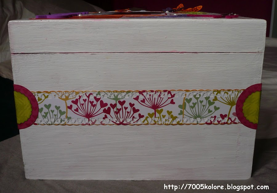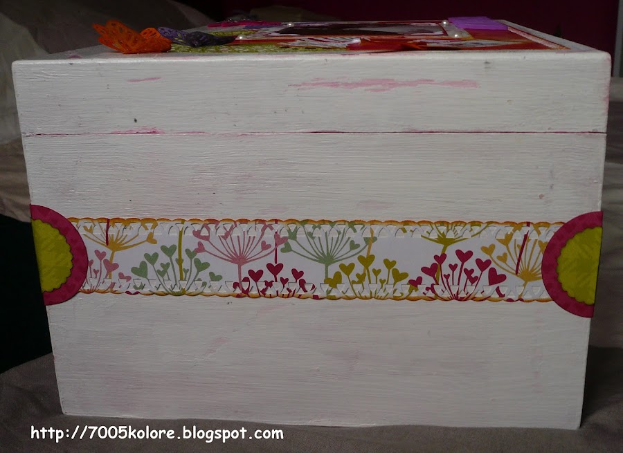 El baúl esta tuneado con los papeles que utilizamos para el álbum y los recordatorios. Compramos la colección de We R, Be My Valentine, porque nos parecieron unos papeles muy alegres y coloridos, con muchos tag, detalles, alfabetos, una chulada de colección.