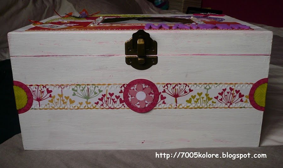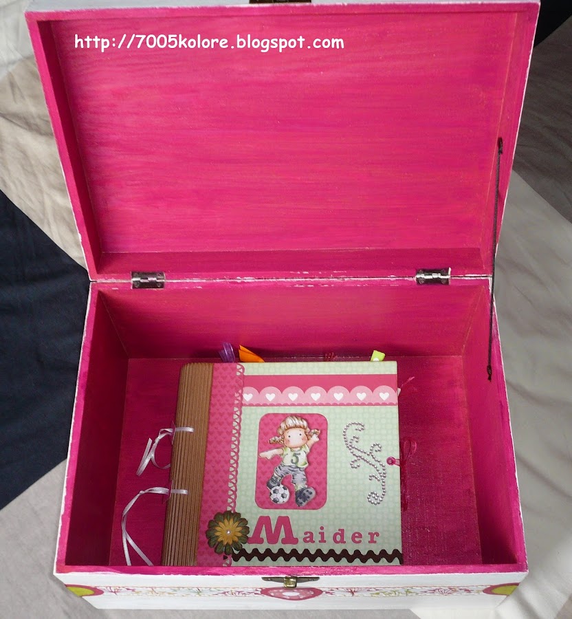 Mi amiga Amaia vio la caja que Ada hizo para el super álbum de cumpleaños de la Yeya y quería algo así para su sobri. La idea era tunear un baúl de madera del Chinatown para que Maider guardara todos los recuerdos de su Primera Comunión junto al álbum que le hicimos como regalo de la misma. Acertamos con el baúl, porque Maider esta como loca con él y con el álbum, pero el álbum queda para otra entrada, ya que se lo entregamos provisional con la intención te añadir fotos de la celebración y el día de Corpus.