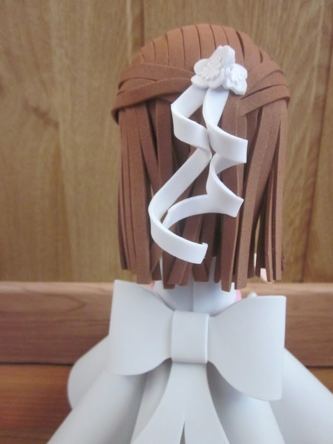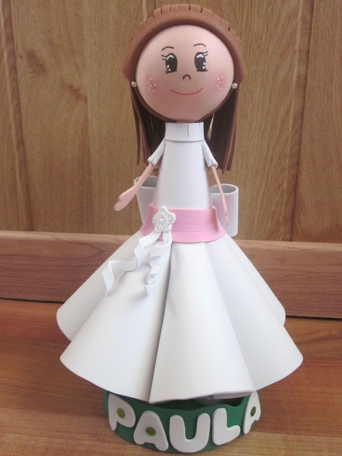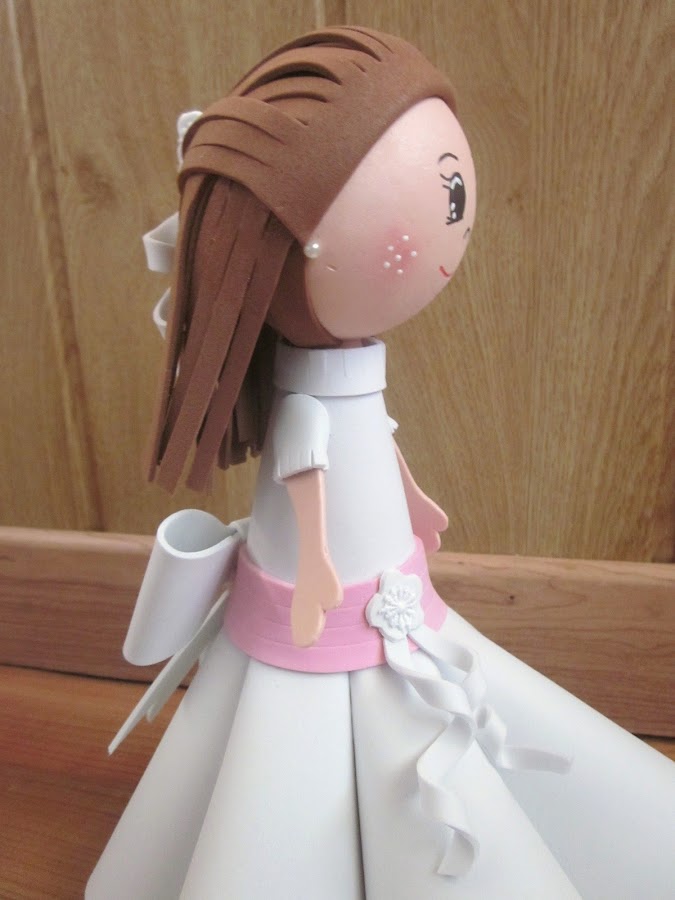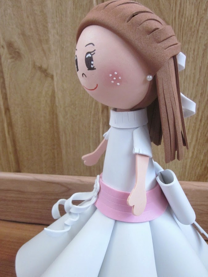 EN ESTA OCASIÓN, ES LA FOFUCHA PARA UNA COMPAÑERA DEL COLE QUE TAMBIÉN HIZO LA COMUNIÓN. DETALLE DEL PRENDIDO Y LA LAZADA CUALQUIER PERFIL ES BUENO