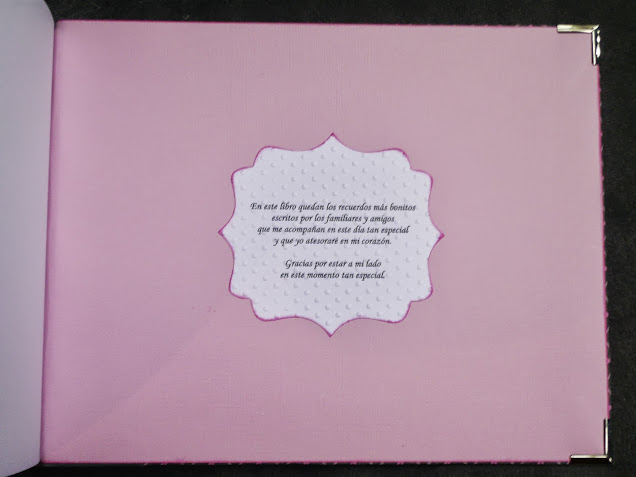 Para entregar el libro, hice un sobre con papel Kraft. La solapa es papel texturizado de Bazzil a juego con el libro de firmas y Washi de motas rosas. El sobre esta decorado con un sello de Gorjuss y unos sellos de "Dilo en Español".
