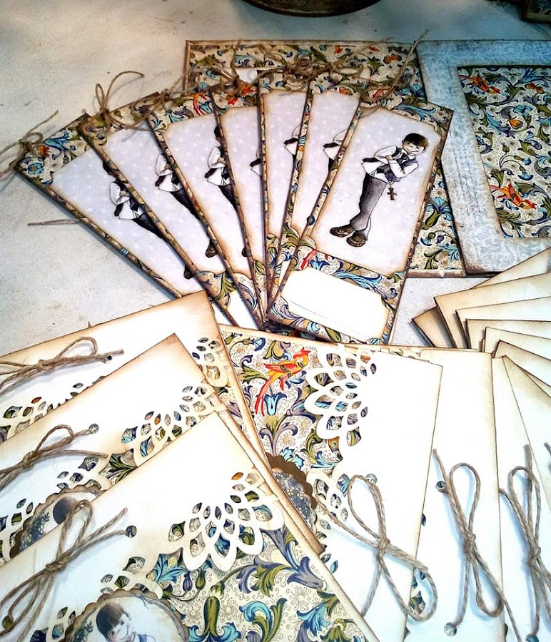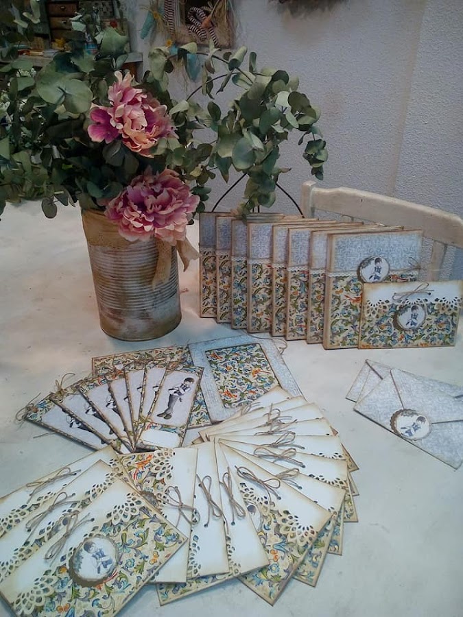 Un conjunto precioso de invitaciones, recordatorios y marcapaginas con un toque rústico.