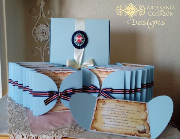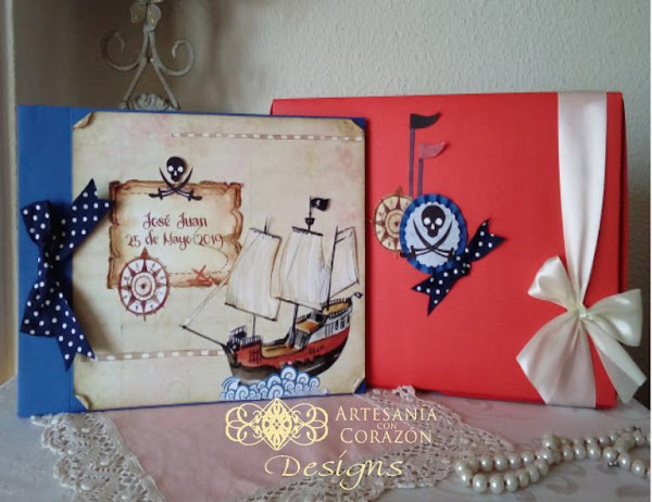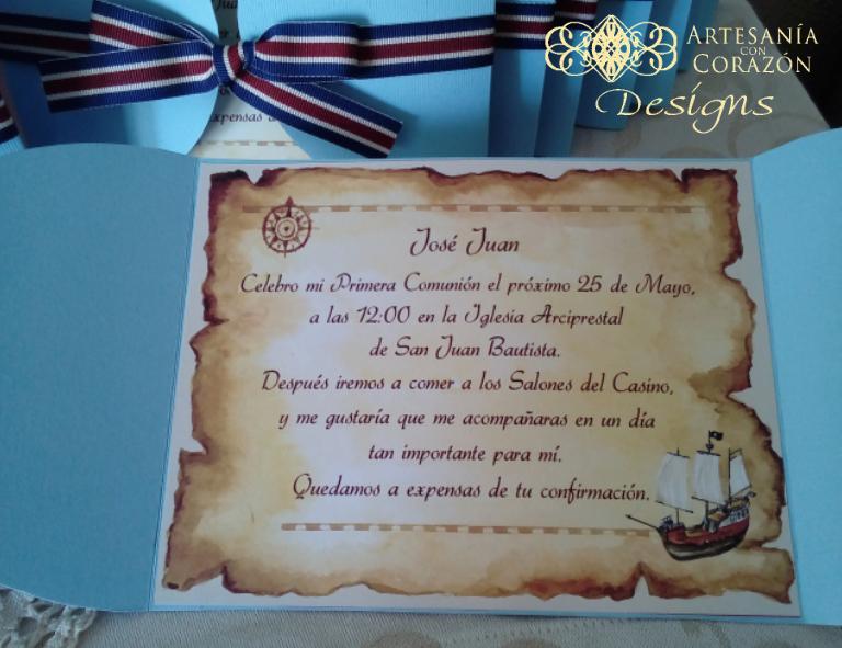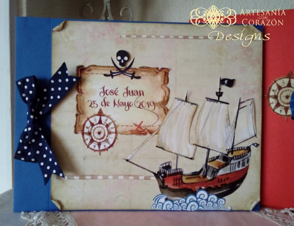 Y para la Comunión de José Juan hemos confeccionado este Libro de Firmas e Invitaciones, tan originales como únicas, con su barco pirata, el mapa del tesoro y la rosa de los vientos, imprescindible para no perder el Norte...