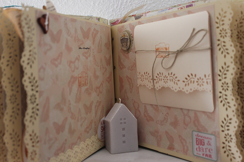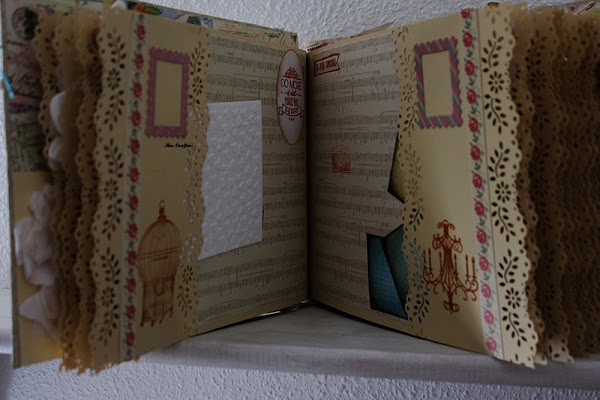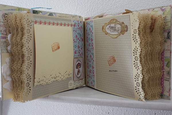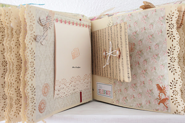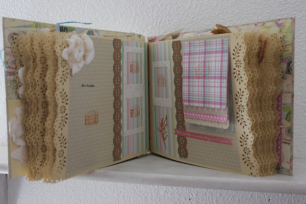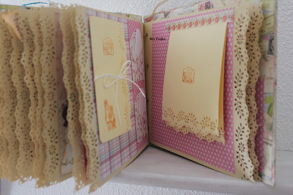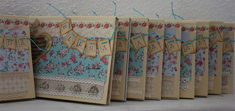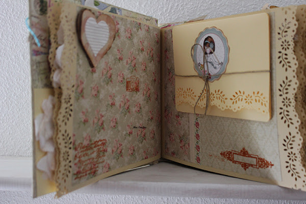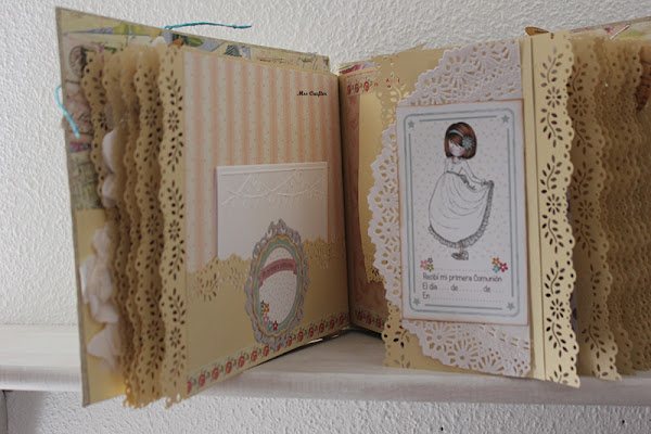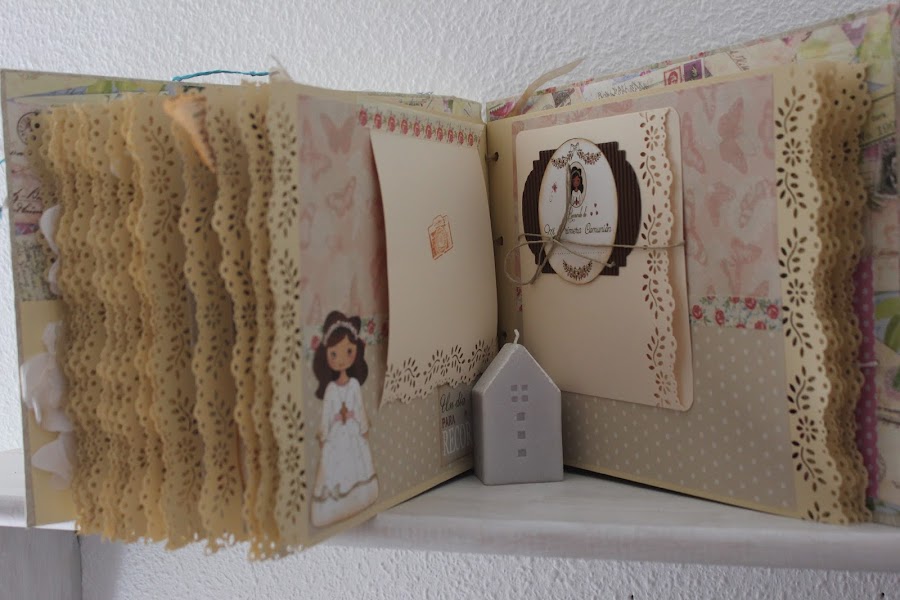 Hoy llega a su destino este álbum y unos cuantos recordatorios. En un estilo muy shaby chic, al gusto de E. en todos los detalles. Y después de unas cuantas conversaciones ultimando detalles e ideas, así han quedado.: Un álbum en encuadernación japonesa con 20 hojas tamaño folio en su interior, infinidad de bolsillos, desplegables, espacio para fotos con su familia, sobrecitos donde guardará las dedicatotias de sus familiares, con capacidad para muchas fotos.Y qué decir de los recordatorios, unos dípticos llenos de detalles en su portada y con marco en el interior donde colocar la foto de la niña.