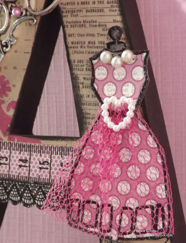El maniquí, embosado, como el resto de los sellos, lleva papel de lunares de la misma coleccion Two Blush. Collar de perlas, cinturon-broche perlado también, y falda de tul.
