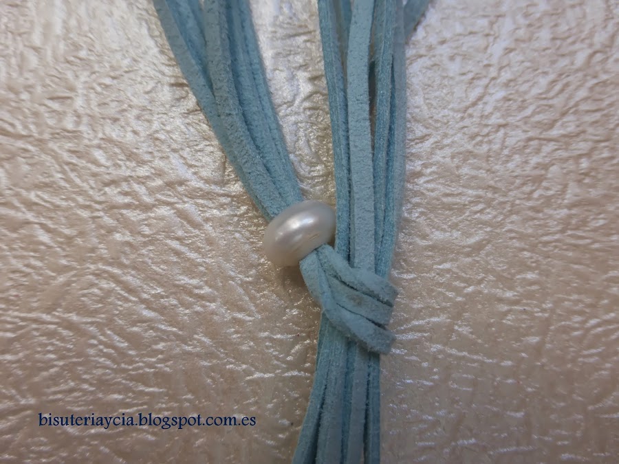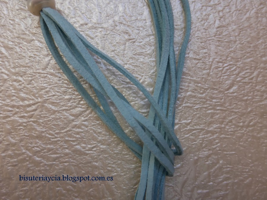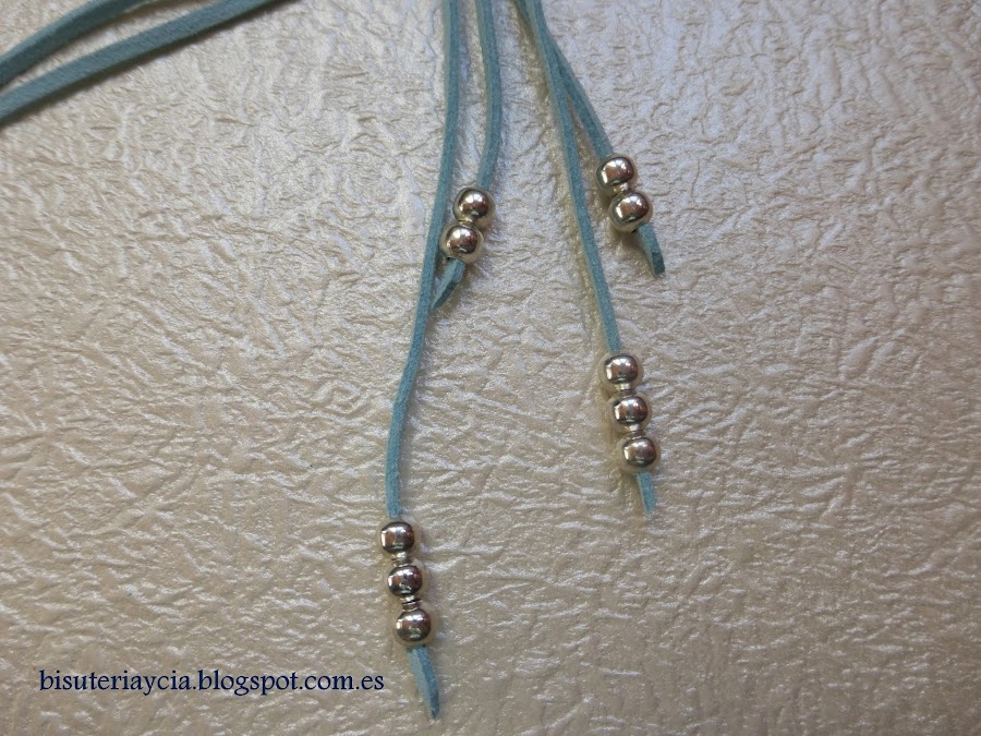 Empezaremos cortando 3 tiras de antelina las cuales doblaremos por la mitad e introduciremos en la perla plana, una vez hecho esto (puede que cueste un poco) introduciremos la punta de los hilos por el espacio que nos ha quedado y ajustaremos la perla.
