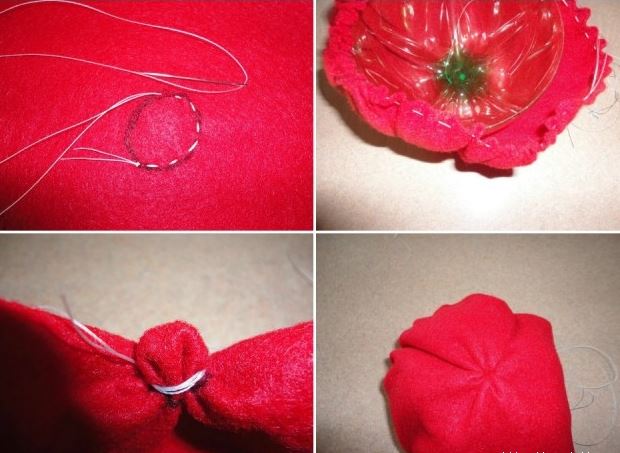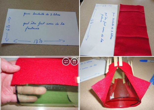 6.- Forra la base de la botella, usa fieltro rojo, usa hilo y aguja para coserlo.