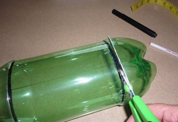 Con un plumón puedes marcar lo que vas a cortar de la botella, en este caso sera la parte inferior y la parte larga de la botella.