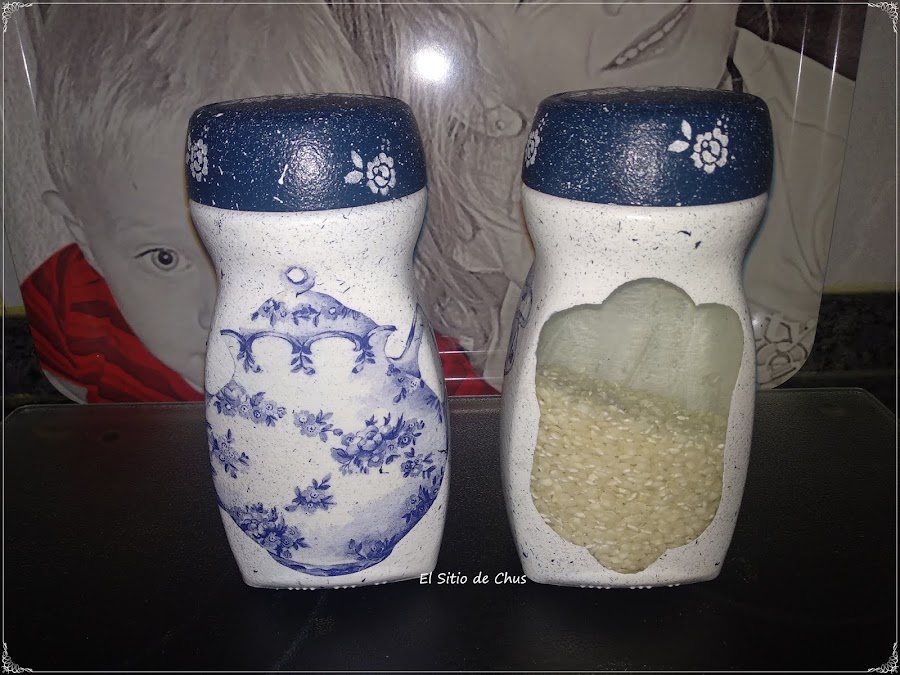 Pinté los frascos con pintura a la tiza blanca y realicé el decoupage con esta servilleta que ya he utilizado en algunos de los trabajos de mi cocina como la tabla de lavar convertida en platero y el archivador de recetas, recordáis?