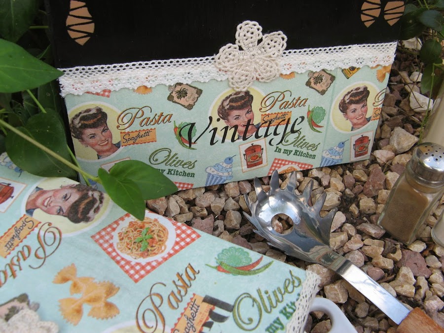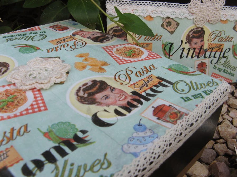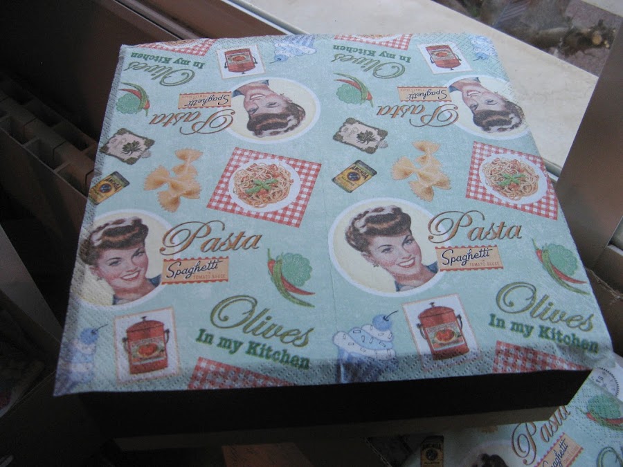 La servilleta es de 25 x 25cm y cabe perfecta en la tapa...luego solo habrá que lijar los bordes para quitar el sobrante de servi