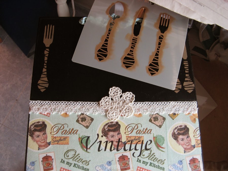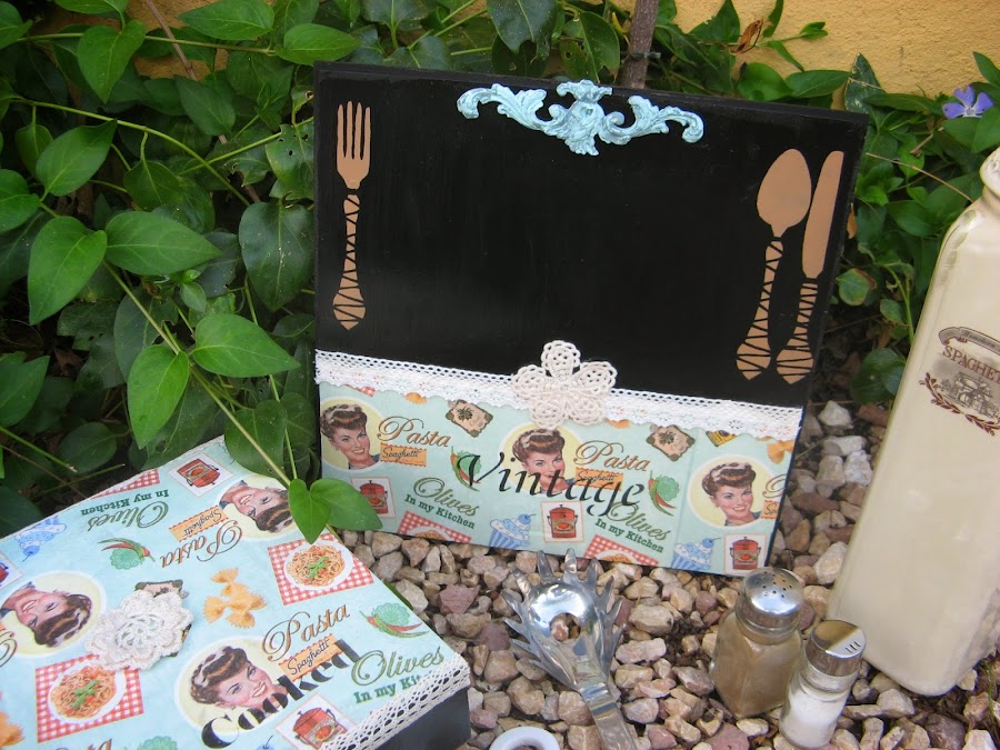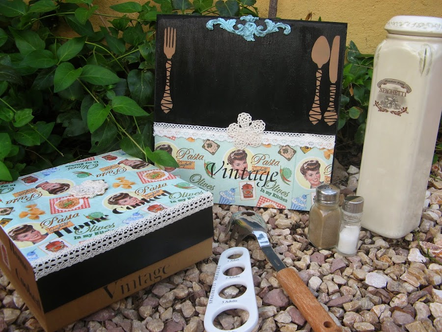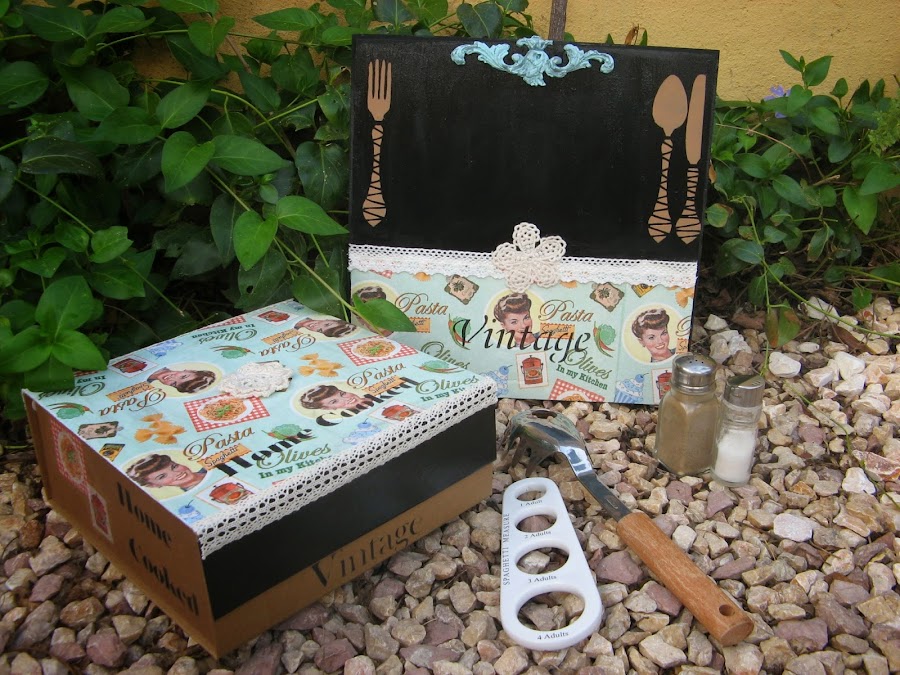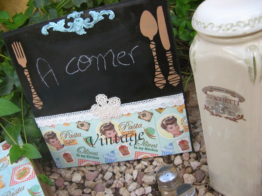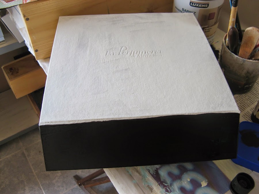 Pintada con pintura de pizarra, la misma servi debajo, unas puntillas, el copete de pasta y los estarcidos con la misma plantilla de la caja