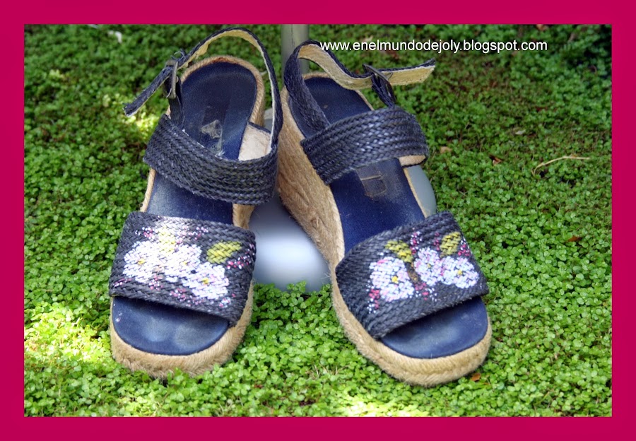 Después pensé en estas alpargatas que llevan conmigo ni me acuerdo y como le iban que ni pintado pues le hice el mismo motivo con las plantillas en la parte de delante de la alpargata.