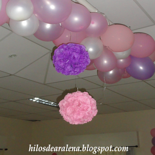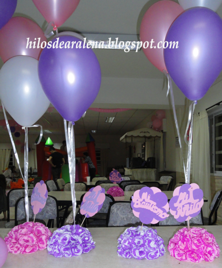 En este caso se trataba de un cumpleaños y bautismo de niña y los adornos del salon, globos , guirnaldas , hasta la torta y souvenirs , eran en tonos rosa y lila.