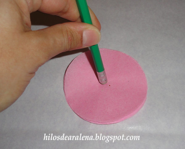 Con la ayuda de un lápiz ( esos que traen una goma de borrar en la punta para que no se rompa el papel), sujetamos el centro.