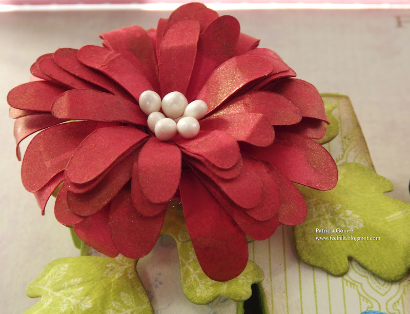 La flor, una de mis debilidades ultimamente (el confeccionarlas, digo) está cortada con la Craft Robo, teñida con Glimmer Mist Red Burmt, enrollada y dada forma curva en las puntas. Por ultimo le añadí los pistilos para hacerla más real. Las hojas que la acompañan son el troquel Spellbinders Foliage.
