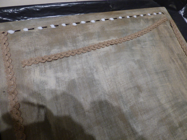 No sé si se vé en las fotos, pero este soporte de madera al ser defectuoso, sólo tenía pespuntes en 3 de sus lados....y no me gustaba nada cómo quedaba, así que con esta cintita estrecha de arpillera los he tapado.
