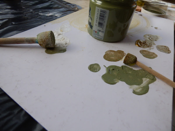 Y así tal cual, con esos 3 colores, he ido dando toquecitos con esponja, cubriendo toda la superficie del marco. En esta foto se vé mucho del blanco, pero luego fuí añadiendo más verde y dorado.
