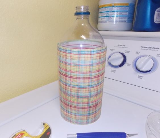 3.-Usa una tela bonita, y cubre la botella de plástico. Puedes usar pegamento para pegar solo en la unión de la tela, ya que si pones mucho pegamento, este mojara la tela y quedara mal pegada.