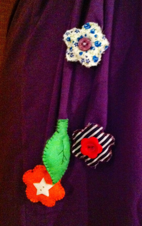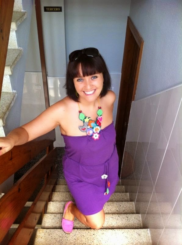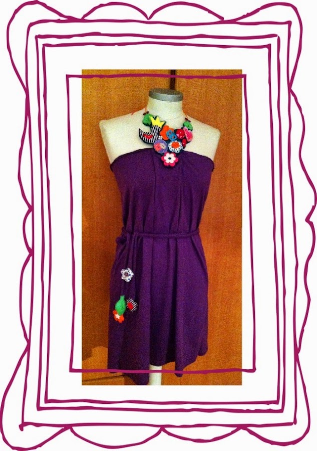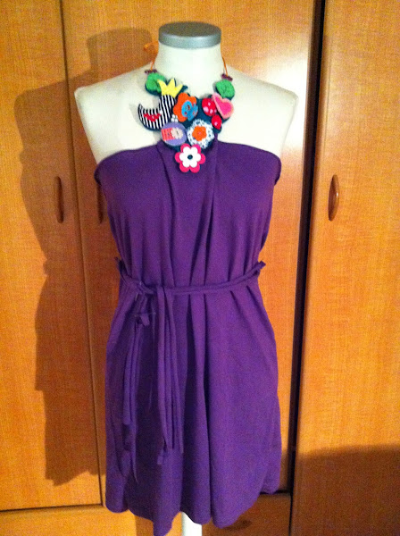 Bueno a lo que iba, me encontré con este vestido y lo comparto hoy con vosotras por que es una idea súper fácil y original y seguro que todas tenéis alguna camiseta grande de vuestros chicos por casa. En este caso yo utilice una lisa que tenia en morado, lo único que hice fue cortarla en recto a la altura de las axilas, remate a maquina con un pespunte, con piezas de fieltro y telas de otras manualidades hice un collar al que le puse unos automáticos al final del collar coincidiendo con el empiece del vestido, para que hiciese el efecto de que es el cuello del vestido, con el trozo que quite de la parte de las mangas y los hombros saque un cinturón que decore en los extremos también con figuras de fieltro. El resultado es muy vistoso, cómodo y super económico!!, no tengo muchas fotos y no son de una gran calidad por que son las que en su día publique en Facebook, no me lo tengáis en cuenta jejeje