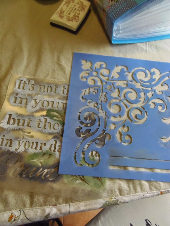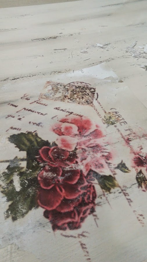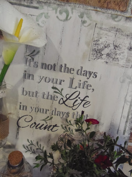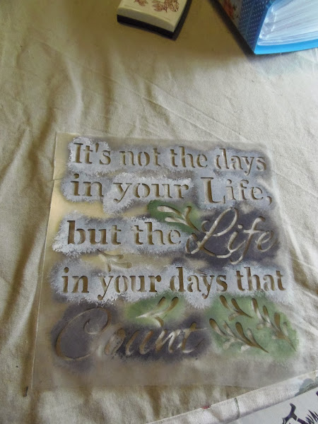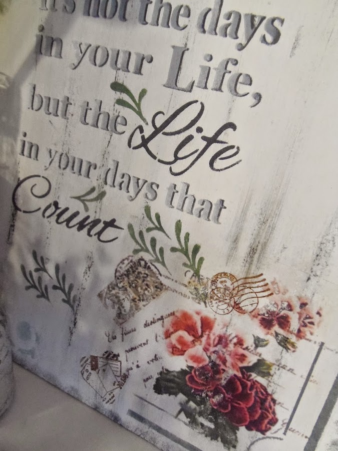 Tabla pintada con pintura qué me había quedado de pintar una habitación,jeje..aquí no se tira nada,un poco de color gris oscuro debajo,lijado y unos sellos,unos stencil..