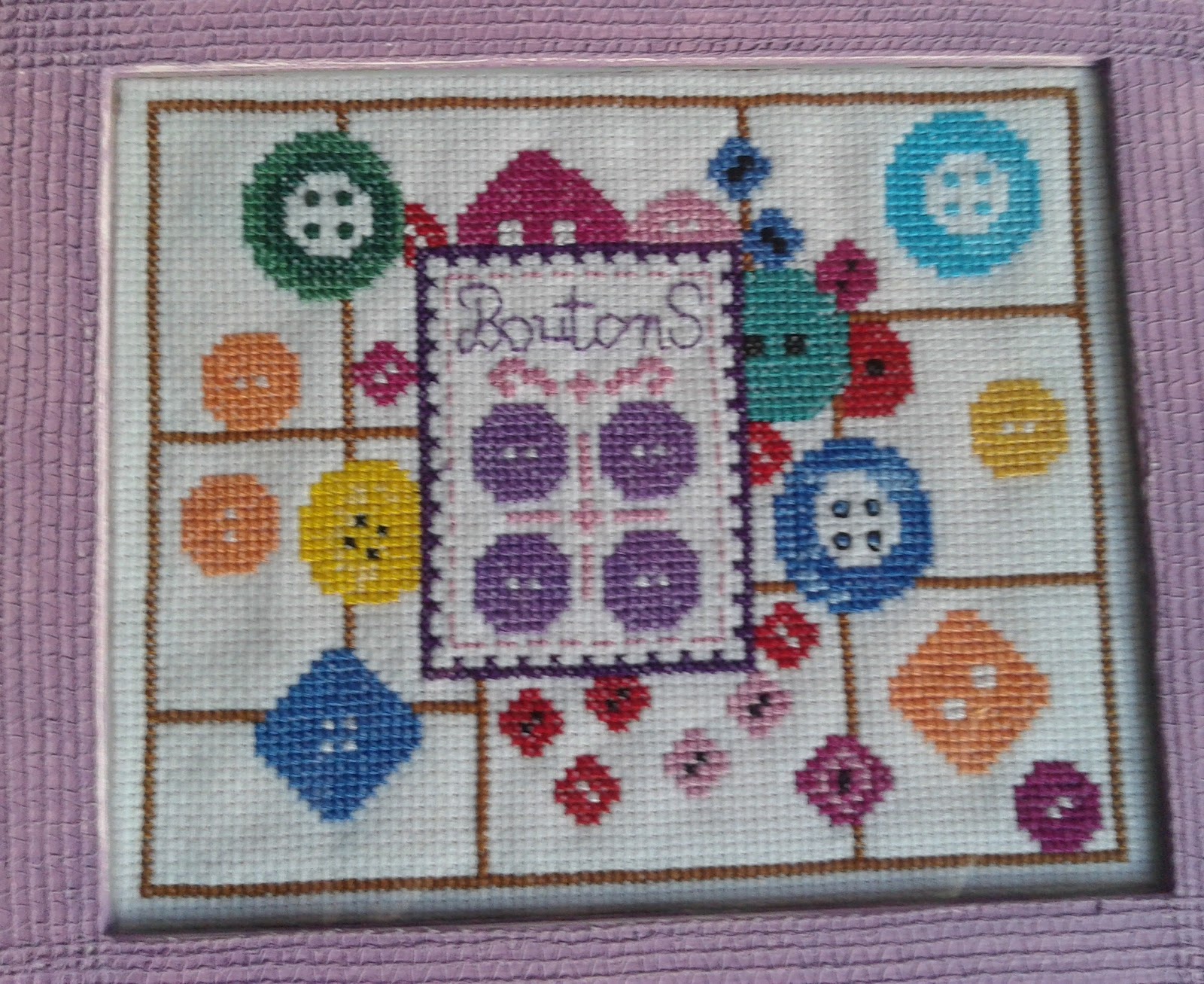 Debajo del cristal, como no podía ser de otra manera, le hice un bordado a punto de cruz, con motivos de varios botones, pues esta es la finalidad de la caja: una caja guarda- botones, con cierre , para que no se abra, ni se mezclen los botones cuando se mueva la caja.