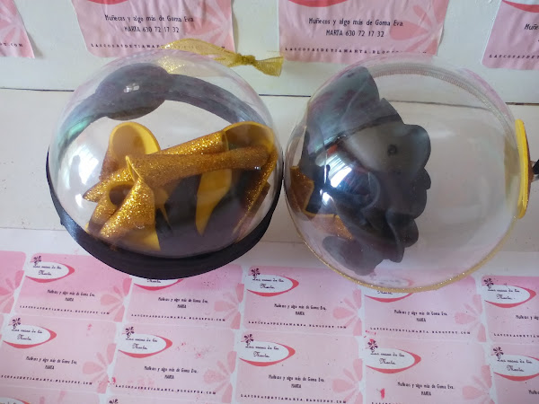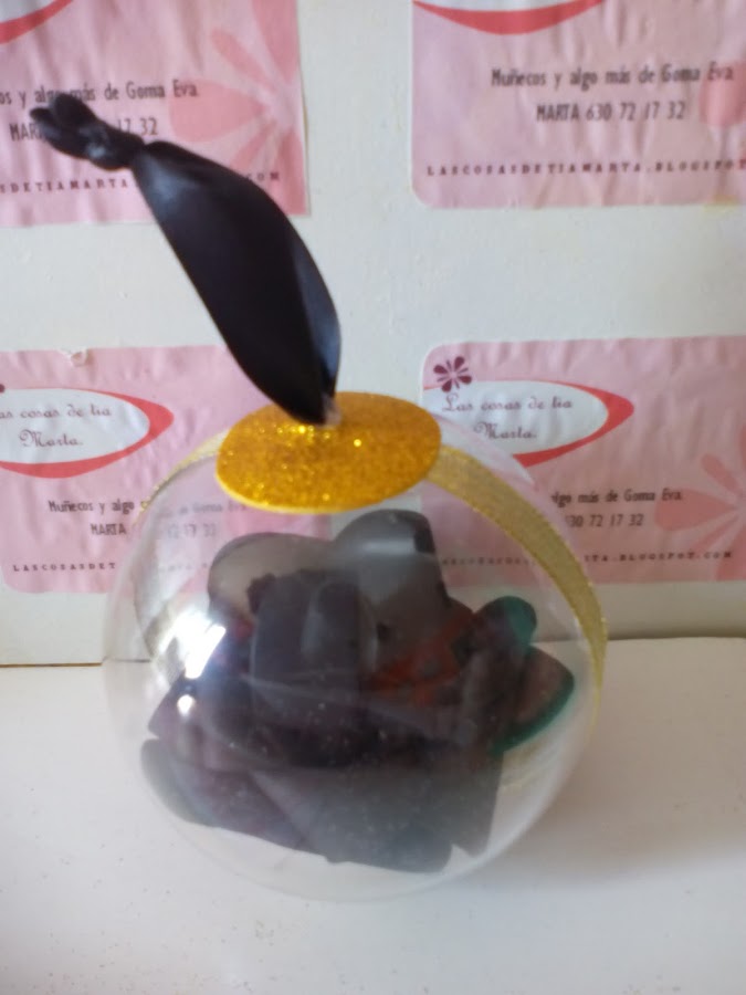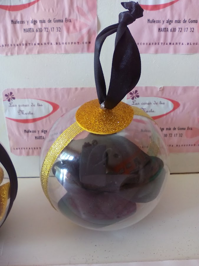 8. Con ayuda de un círculo de goma eva dorada tapamos el empalme de la bola de Navidad. Colocamos un lazo negro y ya estará terminado.