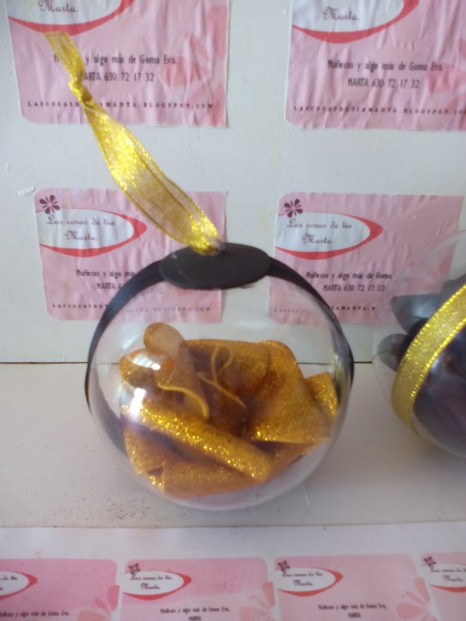 7. Para rematar y cerrar bien la bola colocamos una pequeña tira de cinta de doble cara y pegamos lazo dorado.