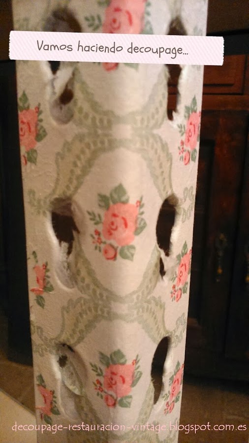 Un detalle de una flor en la parte de enfrente con técnica tránsfer. Finalmente barnizamos todo con un par de manos de barniz satinado. Aquí ya véis cómo han quedado las dos estructuras. Ahora en la siguiente entrada ya veréis para que las usaremos. Espero que os guste cómo han quedado!!