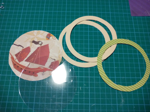 1. Cortamos un círculo de 11cm de papel de scrap decorado, otro de acetato, dos de goma eva.