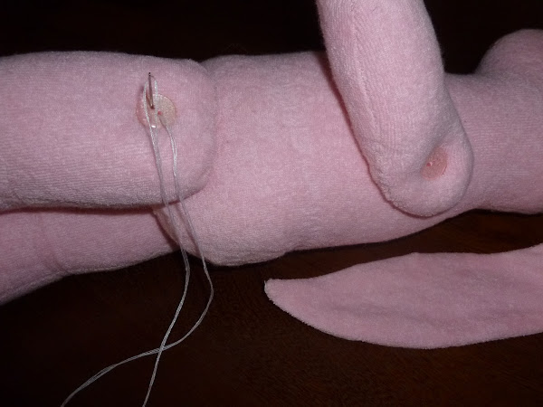 5- cortar 2 piezas en tela lunares como las orejas y 2 piezas de cartón.