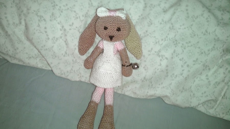 Así que manos a la obra. Me puse con el gancho conejil y el hilo más gordo a hacer otra conejita. Como he dicho antes seguí manteniendo el detalle de las orejas de distinto color. El vestido también es el mismo, aunque esta vez no lleva estrella, tengo todavía que ponerle algo porque no me termina de convencer sin nada, pero tampoco encuentro el detalle que me guste realmente, y por esta razón está todavía sin entregar.