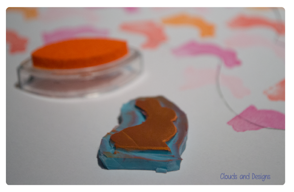 Ahora toca el turno de los sellos y las tintas, hay que cogerlos e ir estampándolos por dentro de la silueta que tenemos... hay que tener mucho cuidado en poner muchos sellitos en los bordes para que después la silueta sea reconocible, y luego rellenar de forma más o menos uniforme el interior (cosa que yo no he conseguido muy bien).