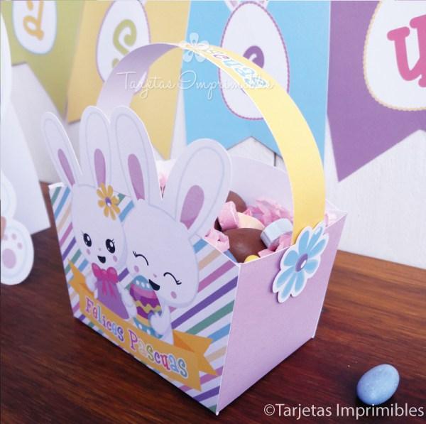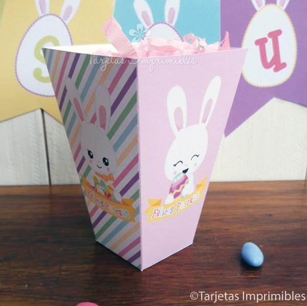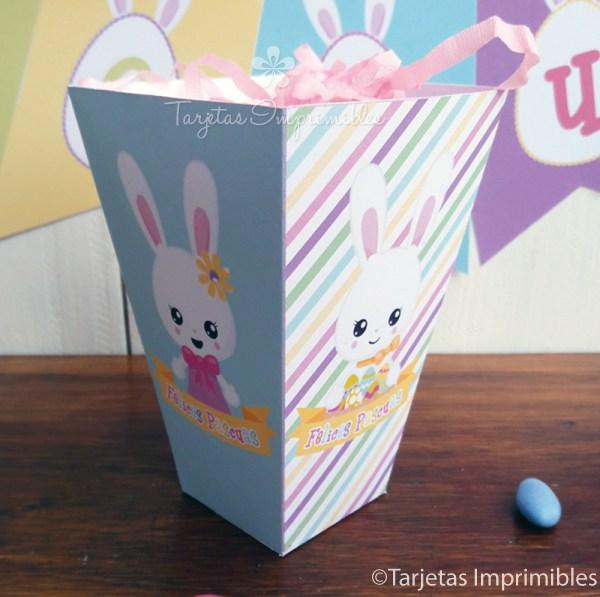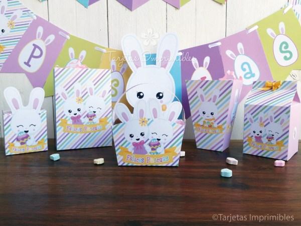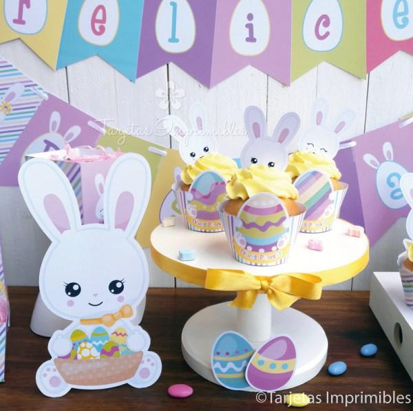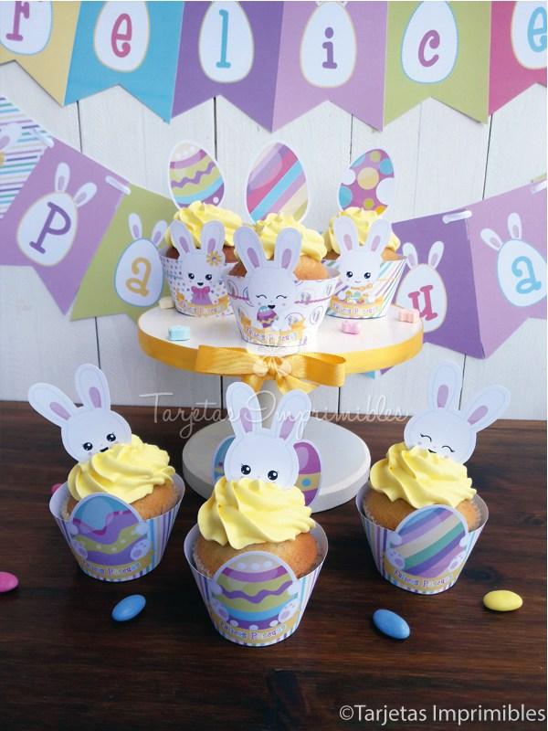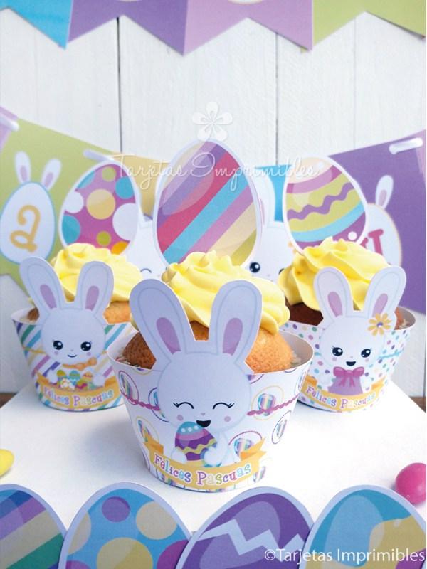 El kit imprimible Conejos de Pascua consta de decoraciones, cajitas de diferentes formatos y tamaños, y wrappers para cupcakes. En estos momentos los cupcakes se apoderaron de todas las mesas dulces, y no podía ser menos en estas Pascuas. Pero no te asustes, si la pastelería no es tu fuerte, puedes hacer los cupcakes básicos y decorarlos con los wrappers de conejitos de Tarjetas Imprimibles.