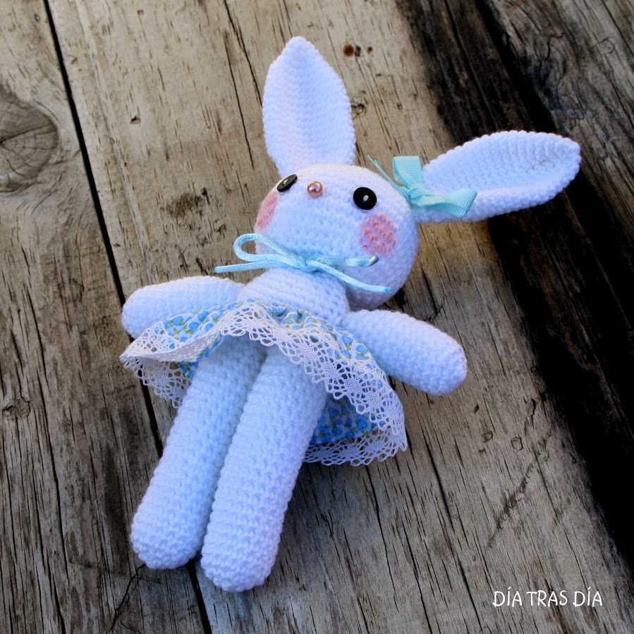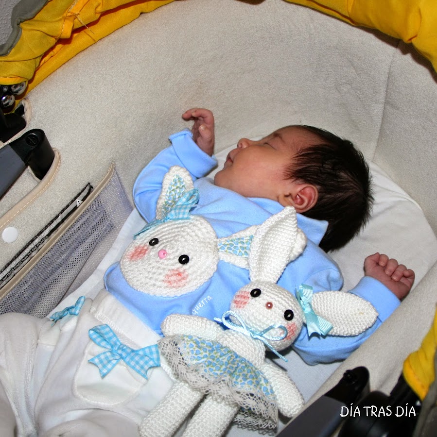 Hace ya varios meses me propuse empezar a hacer los regalitos para Nadia. Comencé haciendo un muñequito-sonajero con forma de conejito. Lo hice empleando la técnica del amigurumi y una vez terminado de tejer, lo dejé un poco aparcado. Y lo dejé hasta el día en que Nadia nació, día en el que me dije que tenía que terminar todo lo que tenía en mente hacerle.