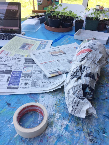 Yo comienzo así mis proyectos, haciendo las primeras formas con papel periódico arrugado, que voy pegando con cinta (de enmascarar) de forma muy burda, lo que me interesa es tener los tamaños (proporciones) primero.