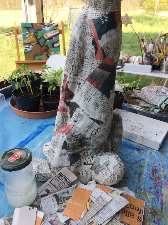 Claro que ya en mi cabeza tengo una forma inicial de lo que quiero hacer y por ahí me voy, ya en el proceso varían los detalles. Cuando ya tengo los volúmenes paso a pegar los trozos de papel periódico, de ahí el nombre de la técnica: Cartapesta, que se supone que es un término italiano que es traducido en español como: papel maché, aunque ésto no sea muy exacto, por lo cual se acepta el término, "cartapesta" para la técnica de pegado de capas de papel, a diferencia del "papel maché" (término francés) que es con pasta/pulpa de papel.