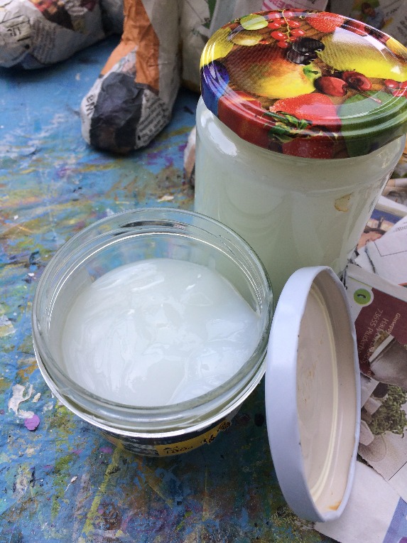 Entre tanto se me acabó el pegamento, así que me busqué el blanco (cola de carpintero) de siempre, lo diluí en agua y pretendí seguir pero no me funcionaba! para esta técnica tus dedos deben deslizarse sobre la forma y la cola se "pegostea", total que a hacer el engrudo de toda la vida: agua, harina de maíz (maizena) y limón. Esta vez usé vinagre en lugar de limón, los dos sirven para que se conserve por más tiempo.