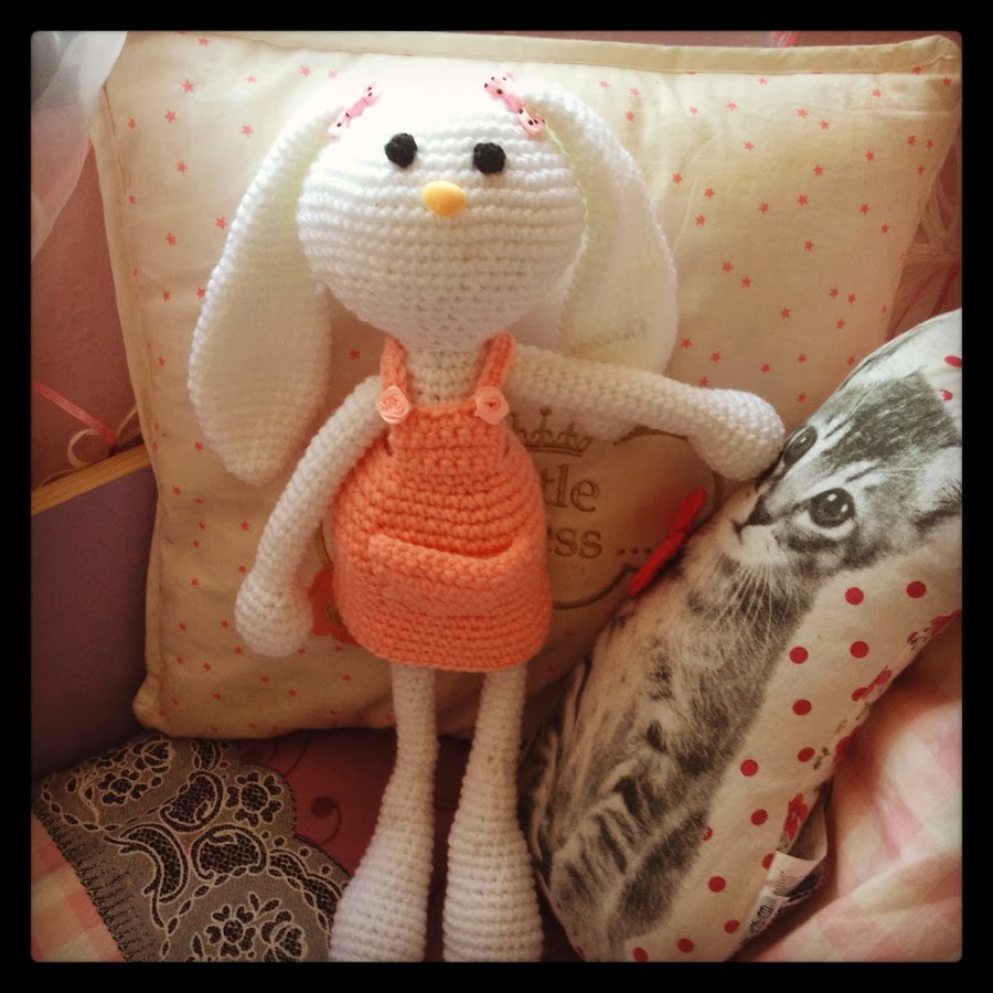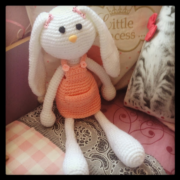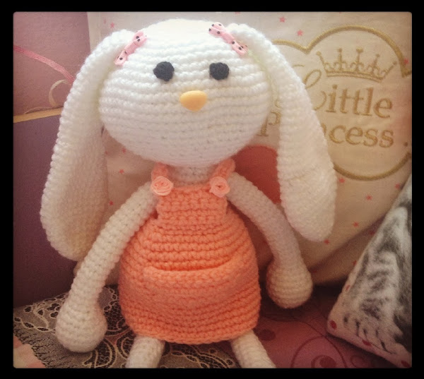 Es una conejita que mide unos 40 cm. sin contar las orejas, hecha totalmente en blanco, salvo el vestido en rosa clarito.