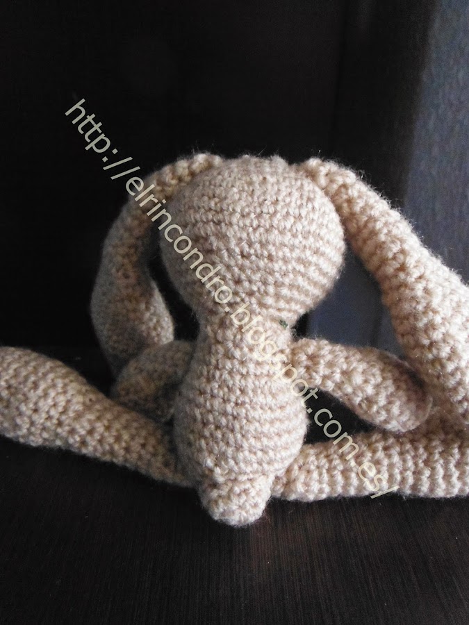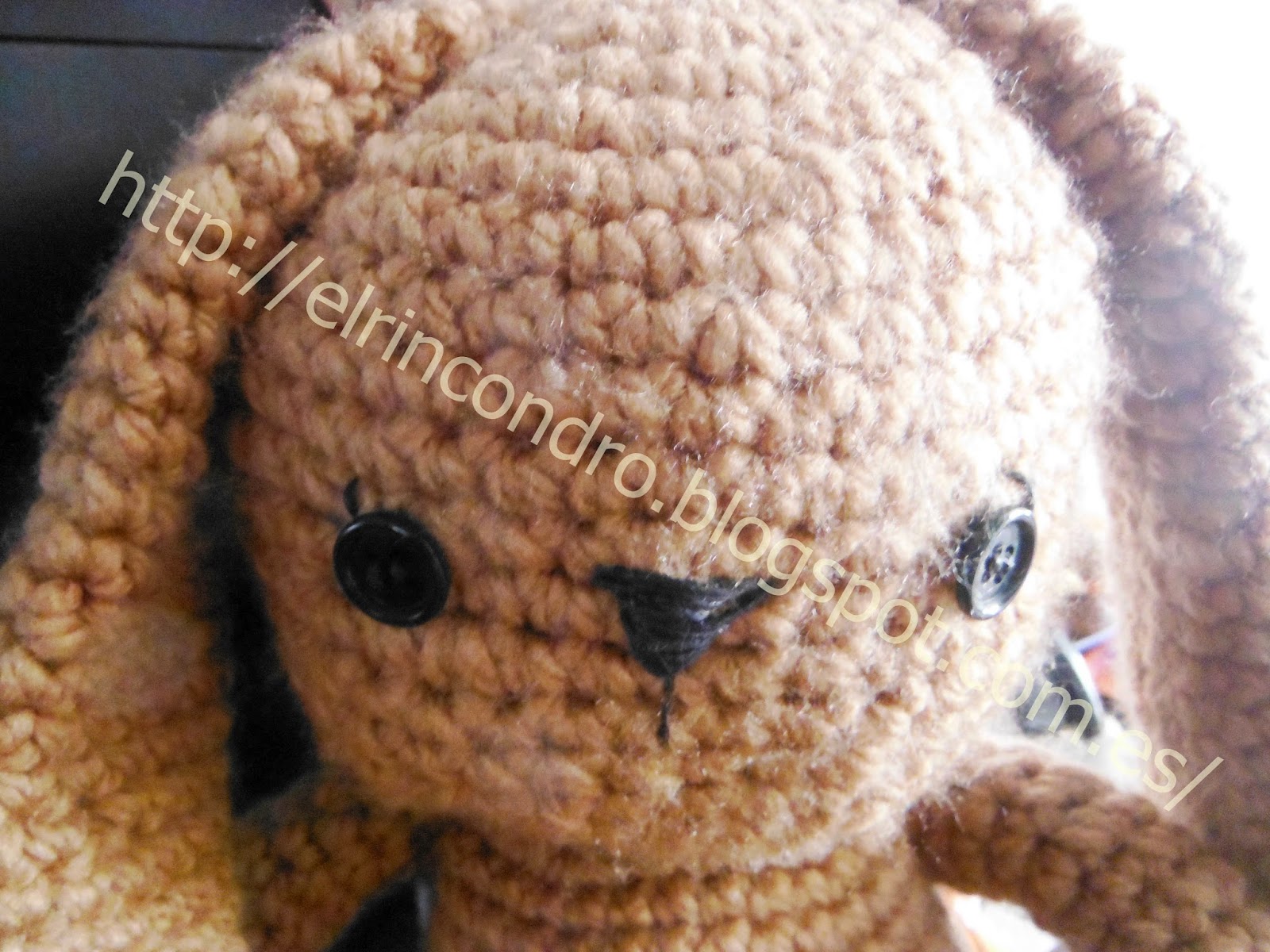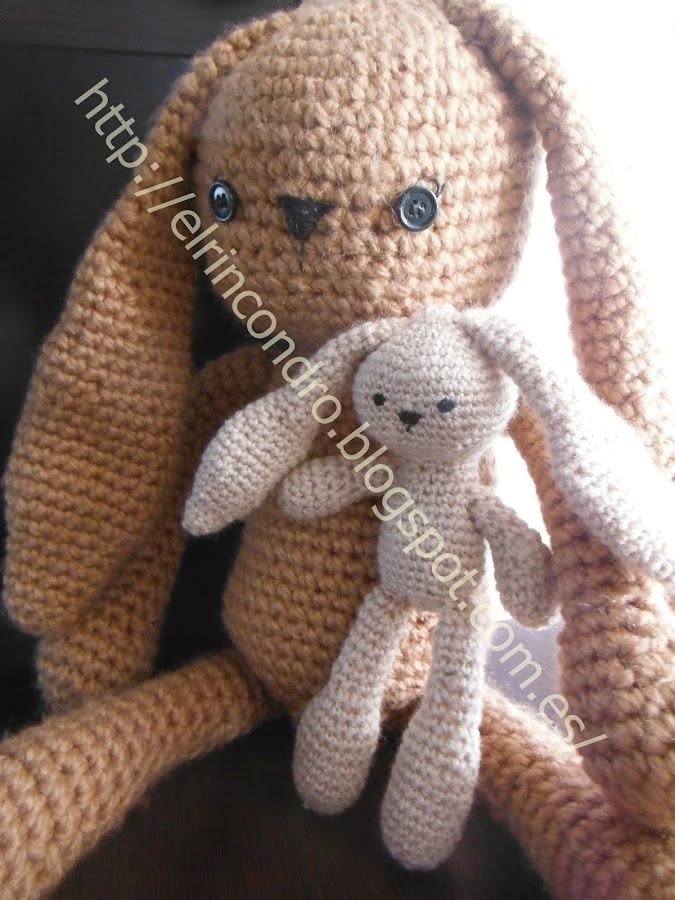 Para que veáis la diferencia de tamaño, el grande esta hecho con ganchillo del número 8 y la lana era para 9. Y el pequeño ganchillo del número 3 y lana de 4-5. Además los ojos en el grande son botones mientras que en el pequeño van con hilo.