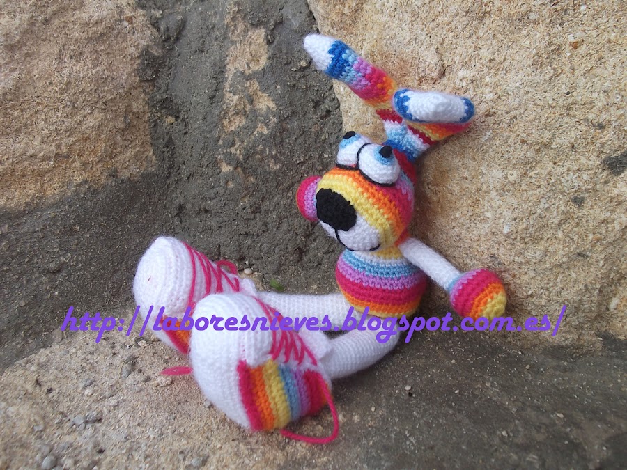 Estos conejitos tienen como base las instrucciones de Raffa la Jirafa, que pueden encontrarla también AQUÍ La diferencia radica en las orejas, las piernas que son más cortas, la colita y el hocico. Éste es otro patrón adaptado y el resto hecho al ojo, el cuerpo y la cabeza son prácticamente iguales. INSTRUCCIONES: MATERIALES: - Hilo de algodón de varios colores - Crochet N° 2,5- Relleno sint ...